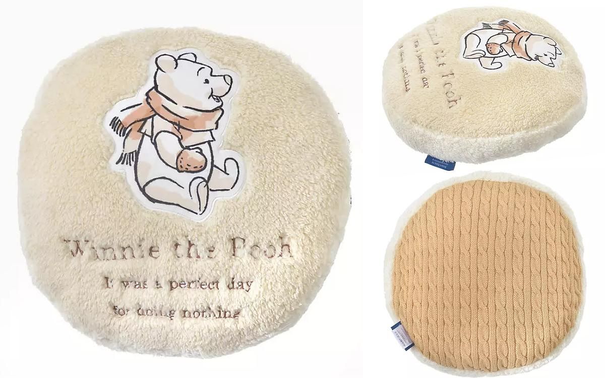 圓潤的小抱枕,一邊是圍著圍巾又戴上手套,看起來十分溫暖的快樂維尼,另外一側則是焦糖奶茶色的編織設計,兩邊截然不同的設計,無論是視覺或是觸感都予人濃濃的溫暖幸福感。