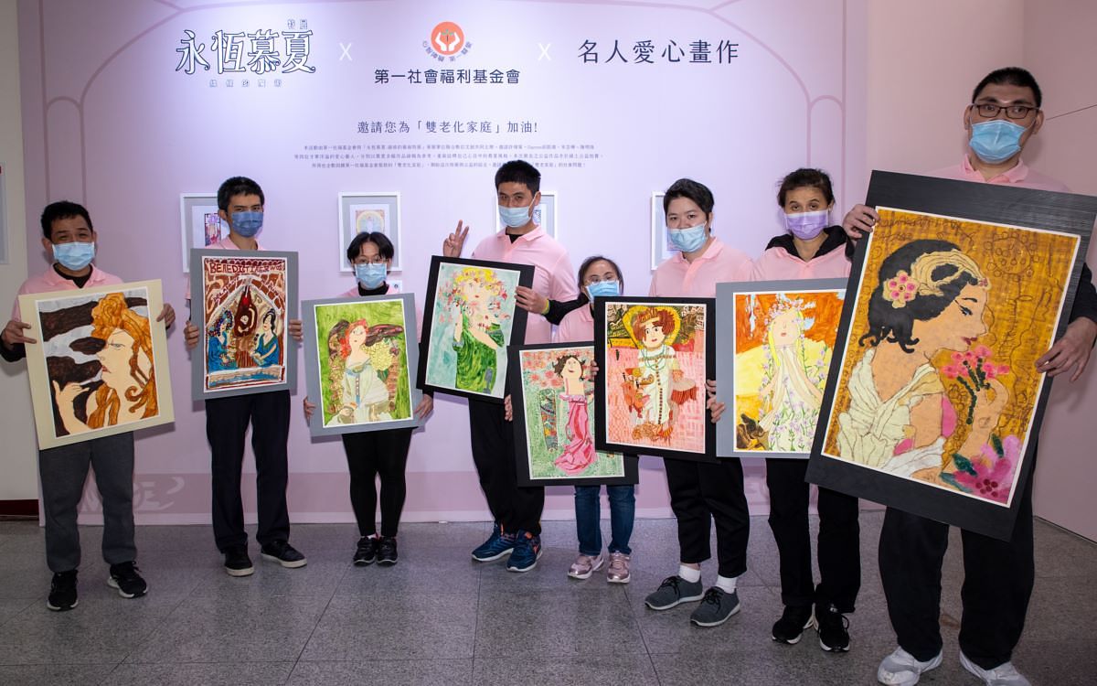 第一社福基金會專門辦理心智障礙者的照顧,這次與「永恆慕夏特展」除了名人公益畫合作外,還讓8位童心寶貝(成人服務對象)在美術老師的指導下仿畫慕夏作品,第一社福執行長賴美智表示,在服務的歷程中發現,透過藝術性的媒介,例如繪畫,可以幫助心智障礙者抒發壓力、表達情緒和感覺,不僅增加心智障礙者的定性,更增加他們的成就感及自我信心,這些獨一無二的慕夏風格二創作品也將在展場外公益牆展出。