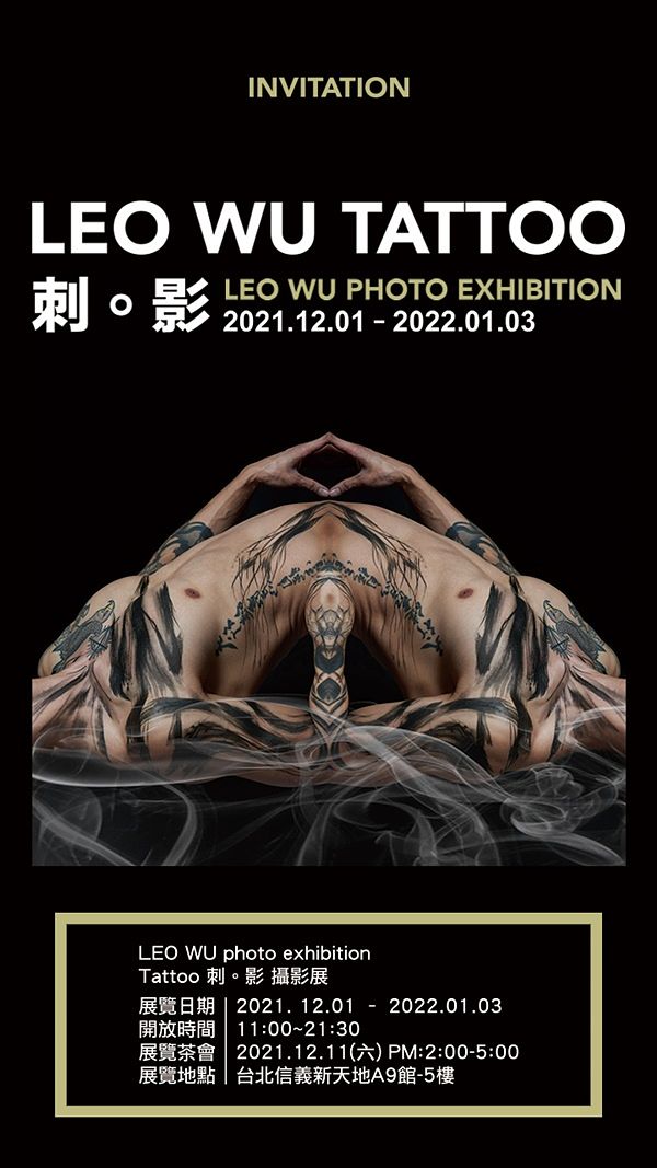 2021年Tattoo 刺。影 攝影展靈感來源於台灣的 < 刺青藝術 > 與怪奇悠謬的遠古傳說 < 山海經 >,刺青的每個圖騰對於被刺者都是帶著一個深刻的意涵,不論是神像,花卉骷顱等都是一個專屬自己不論是身體或是精神的影像密碼和意涵,Leo Wu將刺青的身體密碼,從光影與圖騰的交織流動和奇幻瑰麗的山海經中,帶有力量與精神的神獸概念,將刺青者內在的強大能量與爆發力,在作品中展現!