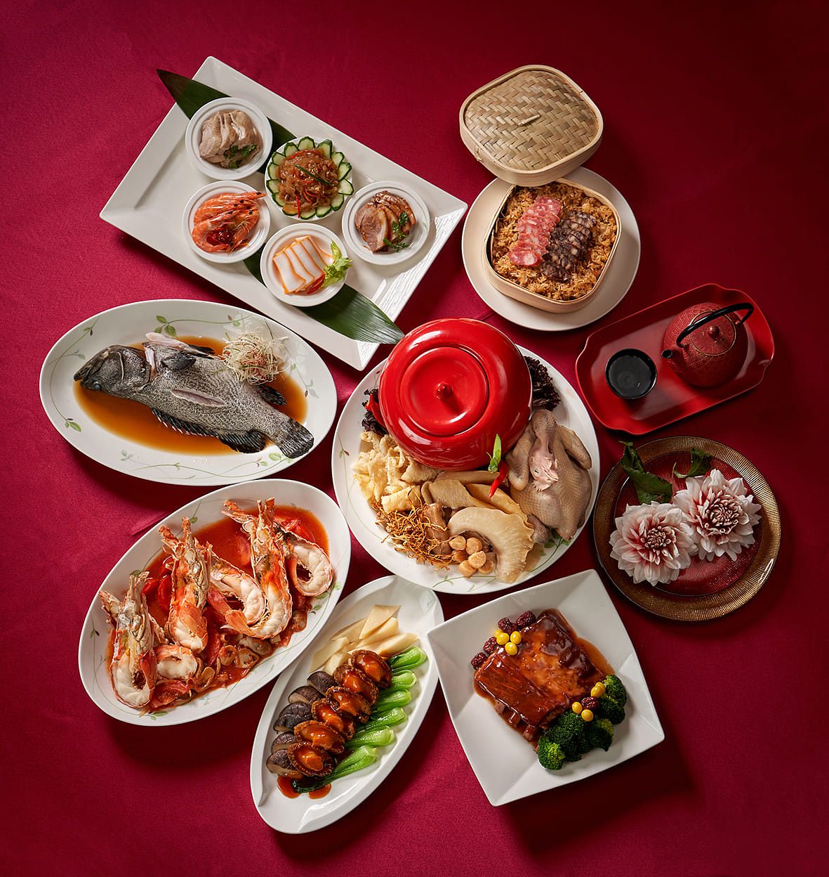 菜色:蕃茄龍蝦煮、御品珍膳雞燉翅、清蒸龍虎斑、鮑魚扒雙冬、紅麴煨腩排、福祿壽五福大拼盤 (蔥油雞、紅麴酚蹄、紹興醉蝦、涼拌海蜇、滷花枝)、 臘味米糕