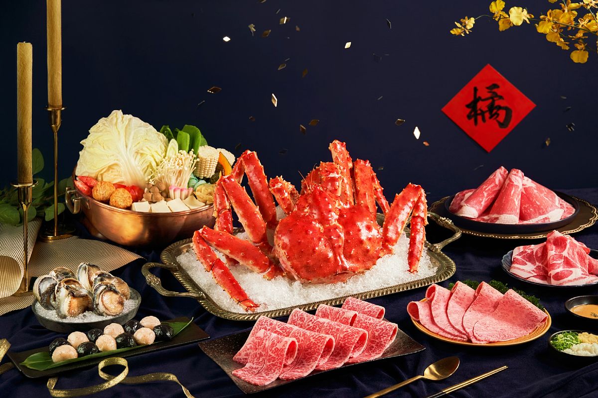 菜色:日本帝王蟹、南非鮑魚、日本和牛翼板、美國頂級小牛排、美國頂級沙朗、盤克夏黑毛豬、綜合野蔬盛合、日本玉米、墨魚丸、鮮蝦丸、蘑菇芝心堡、燕丸、魚餃、醬料