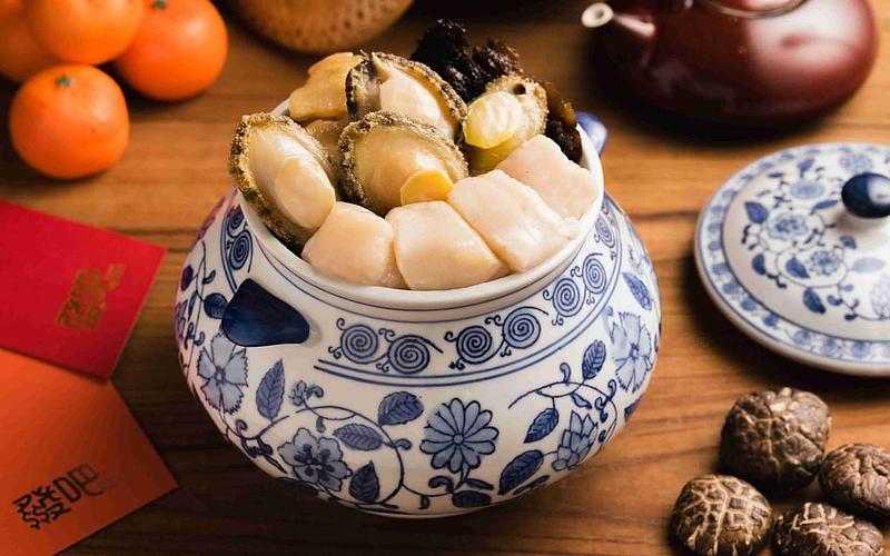 菜色:迎春納福拼(雲耳海蜇頭、醉醃鹹九孔、雙味肝臘腸、紹興迷醉雞、如意十香菜、麻辣香花生)、柚香蜜糖蝦、椒鹽白鯧魚、荔香辣子雞、樹子蒸腩排、八仙佛跳牆