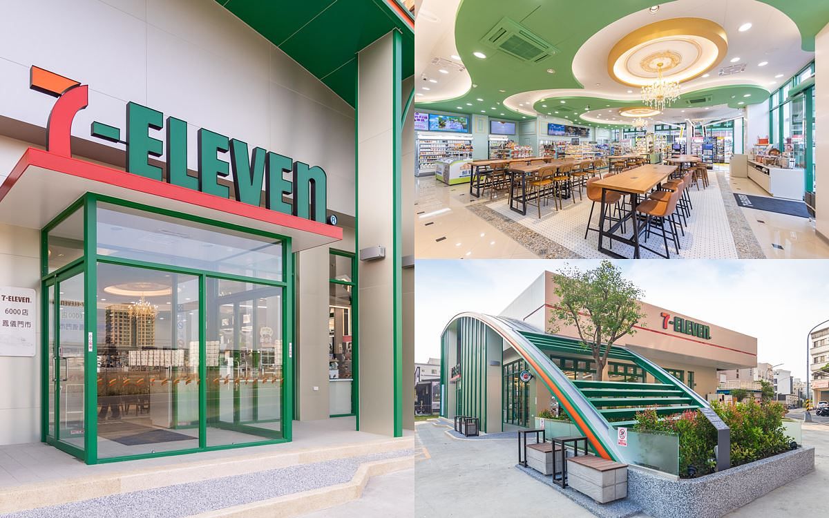 7-ELEVEN 6,000店里程碑「鳳儀門市」落腳高雄市鳳山區,為首家結合建築美學、智能科技、節能設備、綠色生活及複合業態全新永續店型。「鳳儀門市」援引當地知名古蹟「鳳儀書院」定名,結合在地風采形塑一店一故事獨有風貌。門市外觀有如一展溫暖的羽翼,獨特的造型設計加上綠樹、植栽,呈現出生活與自然共存的現代感,營造出有質感的生活空間。門市內空間設計以河川為發想,白、綠主色調象徵川流全景,運用河川彎曲的弧形元素貫穿室內,藉由柔和、優美和跳躍線條延伸視覺效果,象徵 7-ELEVEN循著社區聚落而立,在地連結且生生不息。