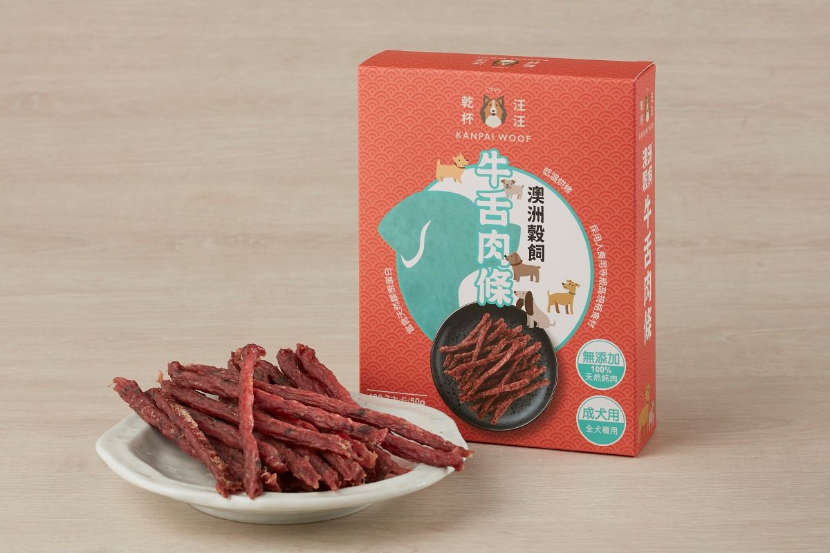 零食「澳洲榖飼牛舌肉條」,由牛舌肉、牛舌皮、筋膜攪碎與樹薯澱粉混合製成,適口性佳,富含豐富膠原蛋白,作為訓練狗狗的獎勵品最理想不過!