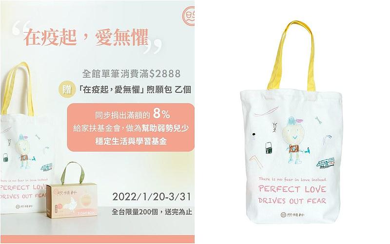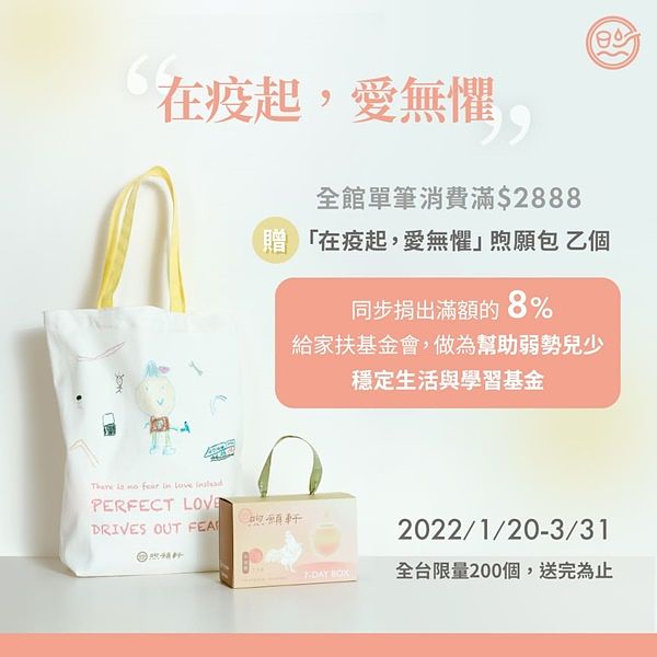 單親家庭的小維,其實是多數家扶基金會扶助的家庭縮影,社工會不定期的提供生活物資,以及針對個別需求提出各式生活與教育面向的方案,逐步建構兒少與家庭脫貧能力,年關將至,煦願軒希望透過「在疫起,愛無懼」煦願包傳遞愛與力量讓孩子們對未來充滿盼望,展開公益計畫,自2022/1/20-3/31,於煦選軒官網(www.genialhearten.com.tw )購買全商品單筆消費滿2888元,即贈送「在疫起,愛無懼」煦願包乙個,同步捐出滿額的8%給家扶基金會,做為幫助弱勢兒少穩定生活與學習基金。(全台限量200個,送完為止)
