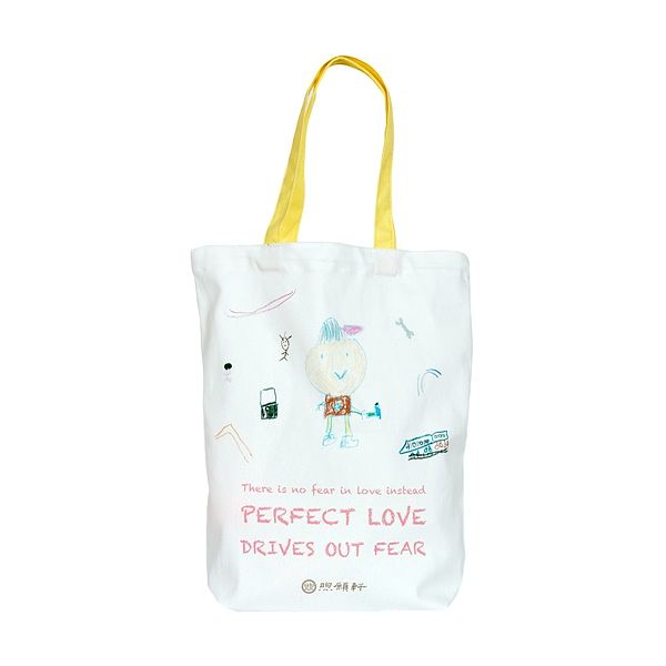 「在疫起,愛無懼」煦願包的圖騰設計,來自於家扶基金會長期經濟扶助的小維之手,他在小學一年級的時候參加家扶舉辦的甘苦生活節畫展,圖中的主人翁就是小維的爸爸,他是位工人,需到各地進行配電與施工,所有的電線只要透過爸爸的巧手就能夠讓電燈照亮、電扶梯運轉,小維心中對爸爸滿是崇拜。