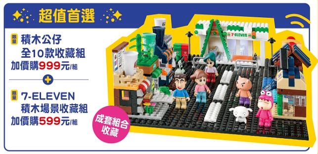 7-ELEVEN全店集點以動漫主角蠟筆小新、爸爸廣志、媽媽美冴...等經典角色結合門市CITY CAFE、精品咖啡、現萃茶、大亨堡、關東煮、御飯糰...等經典商品,推出10款「積木公仔」,分為經典品牌以及迴力車系列,粉絲收集各款後可依喜好任意搭配,變換組合打造專屬擺設,同時更首度推出限量「積木公仔全10款收藏組」及「7-ELEVEN積木場景收藏組」,兩組積木收藏組一起入手最超值,適合全家大小一起組裝,增進親子宅家時光,喜歡蠟筆小新的粉絲們絕對要整組蒐集!
