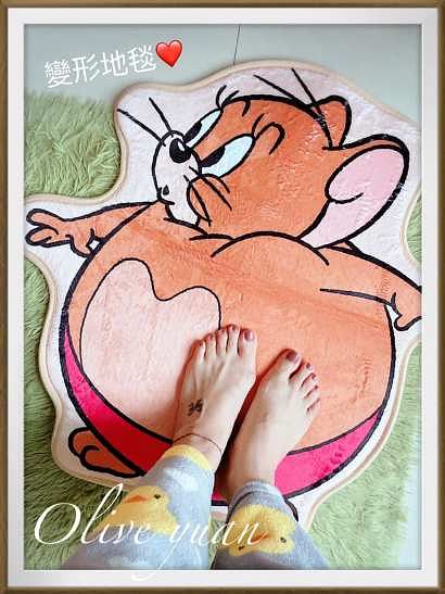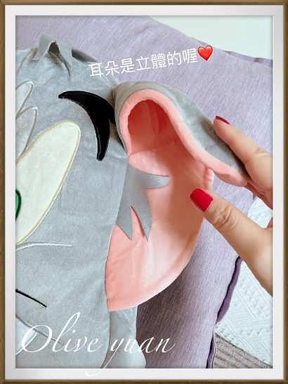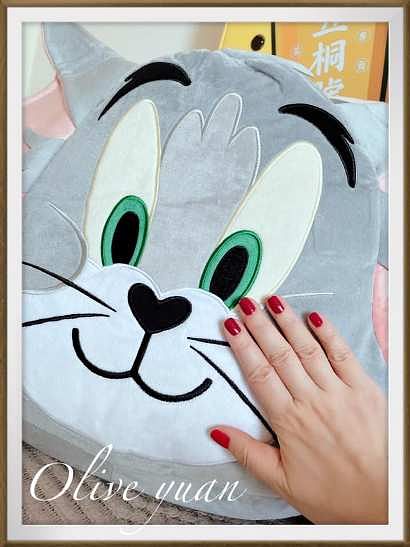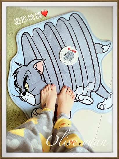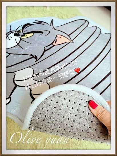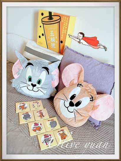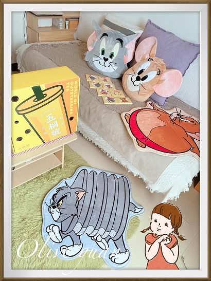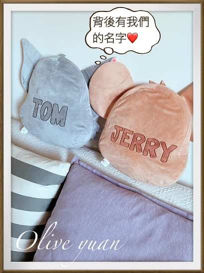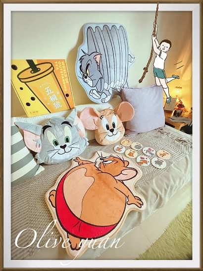 這些周邊商品的製作也都很精緻喔!「大頭抱枕」的耳朵還是立體的,背面也有湯姆貓與傑利鼠的英文名字刺繡,擺在家裡會覺得多了兩位家人,「變形地毯」踩上去超舒服,超柔軟,很療癒,因為它有加厚,而且還有防滑點點。