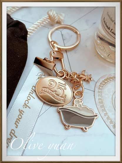 「25週年明星三部曲珍藏組」中還有限量收藏25週年品牌鑰匙圈,象徵著「夢想解鎖(Unlock Your Dream)」,可在鑰匙圈緞帶上輕輕噴灑自己喜愛的香水,讓香氣隨身,上面的浴缸吊飾也超可愛,還冒著泡泡!