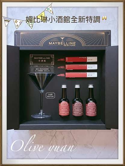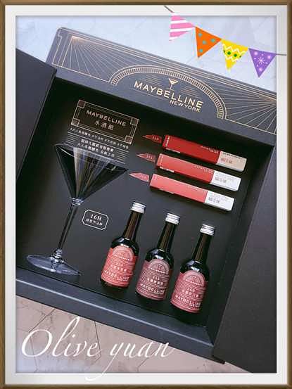 打開的瞬間我有撲哧一笑,太可愛了啦!裡面居然是迷你小酒館(杯子應該也要做成迷你的),這是「MAYBELLINE小酒館到你家」的服務,而且那三瓶調酒是真的喔!重點是「超持久霧感液態唇膏」2022年新色—「大人系微醺色」!