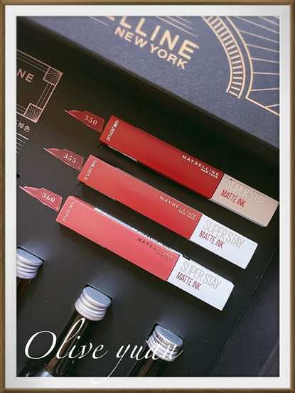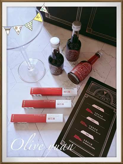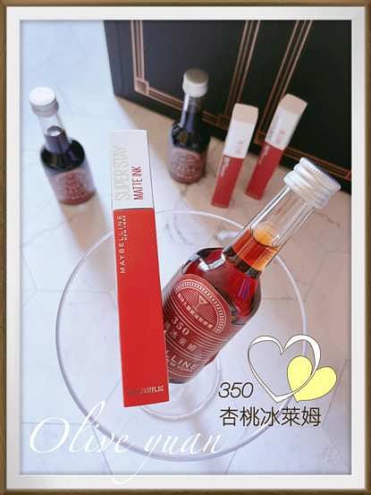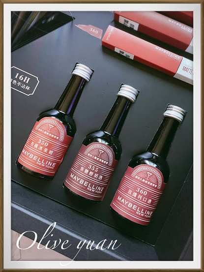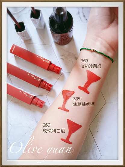 媚比琳「超持久霧感液態唇膏(5ml NT320)」誘人滋味全新上市!有「350杏桃冰萊姆、355焦糖醇奶酒、360玫瑰利口酒」三個顏色,還附了一張試色專用貼紙膜,不然你們以為那個酒杯是我自己畫的嗎?怎麼可能!