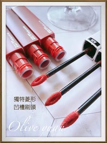 這款唇膏的獨家三大特點就是「超持久、不掉色、不沾杯更不沾口罩」(有啦!手臂試色後來用卸妝油卸不掉,用刷子才刷掉)!高度柔霧絲滑質地,微醺色一抹立顯,還搭配立體凹槽設計菱形刷頭,能精準勾勒唇峰及唇角細節。