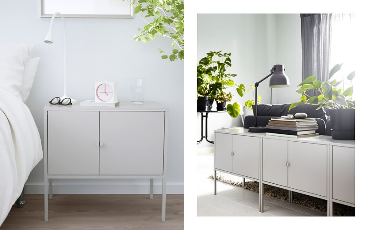 金屬材質的灰色收納櫃,簡潔俐落的方正設計,搭配細長延伸的櫃腳,無論是單放在床頭或是多款組合成為邊櫃都適用。