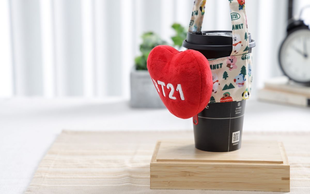 超紓壓的愛心立體玩偶竟是飲料提袋!打開後是超方便的手提式設計,印滿BT21經典角色,附上扣環可扣在包包上,可提可掛最萬用,咖啡手搖控每天帶它剛剛好,響應環保又可愛!