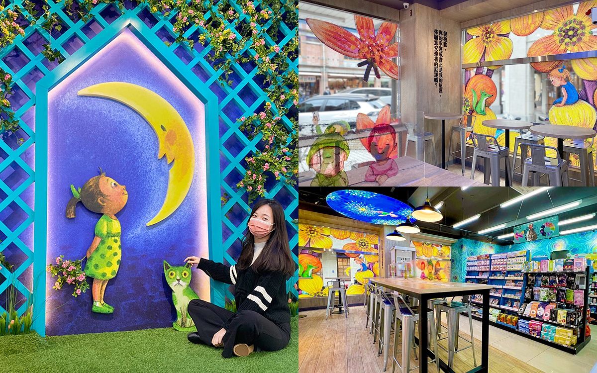 總面積約56坪的大店店格,豐富呈現《幸運遇見你》繪本的各式場景,隨手一拍都是意境打卡照,相當夢幻!整體設計亮點包括主題仿生植栽花牆、商品展示區、休憩區、天花板燈箱等,幾米繪本元素從騎樓延伸到店內的櫃檯、牆面、天花板、主題貨架以及周邊商品皆一應俱全。一入店即可看到大型仿生植栽花牆,還有可愛小女孩、小貓及月亮燈箱迎賓,一旁的商品展示架上,陳列各種幾米繪本限定的醫療防護口罩、收納式環保袋、限定杯、自動開收傘等聯名周邊小物;大門與櫥窗挑選許多小朋友、小動物及花卉等圖騰,以繽紛色彩打造出奇幻時空,讓童年夢境化成現實;休憩用餐區除有不小空間外,桌面採用深色木紋搭配金屬高腳鐵椅,悄悄地融入現代工業風元素,牆面還有幾米書內詼諧趣味的文字,巧妙令人思考著幸與不幸,讓人一秒進入幾米溫柔呢喃的作品內;此外,抬頭更是處處有驚喜,特別把星空元素設計成立體燈箱,置於天花板中,夜間時為進入奇幻空間的旅人照亮路途,堪稱IG必拍打卡點之一。