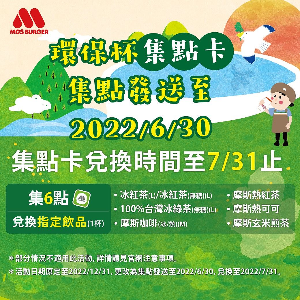 7/1自備飲料杯盛裝摩斯飲料享5元回饋。原環保杯集點發送至2022/6/30止,集滿6點者,可兌換至2022/7/31。