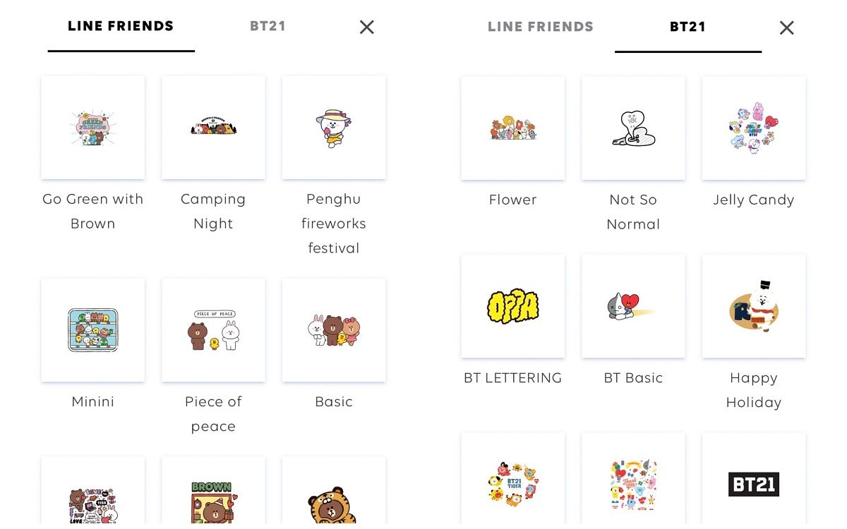 進入素材圖庫中,LINE FRIENDS與BT21的圖案超多元,還有最萌的minini小精靈素材。