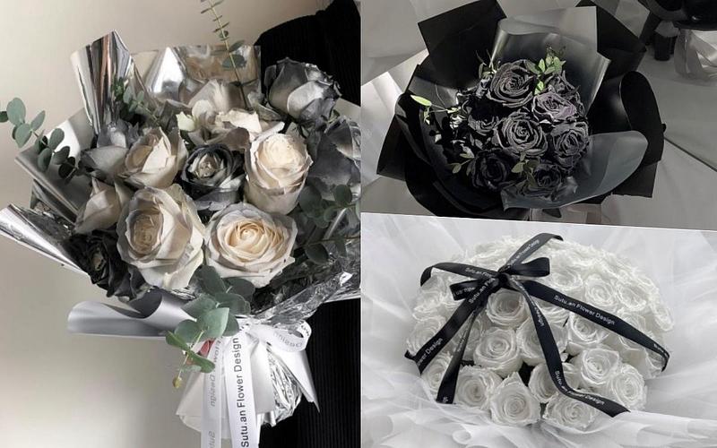 稀有的黑玫瑰如果是鮮花很快就會凋謝,想要長時間保存的話建議可以選購永生花,像這樣特殊色玫瑰花送一次就足以令人難忘,除了用白玫瑰做相互搭配外,大部分都會以滿天星相襯,像這樣一束時尚簡約的黑色花束,不需要太多朵黑玫瑰,一枝獨秀更突顯獨一無二喔!