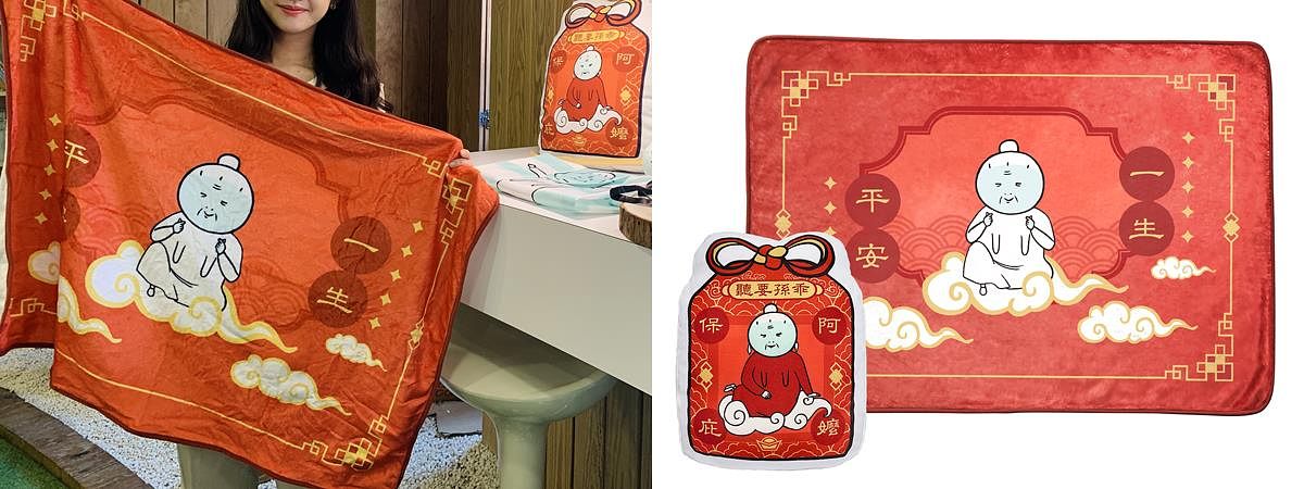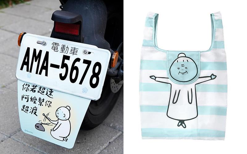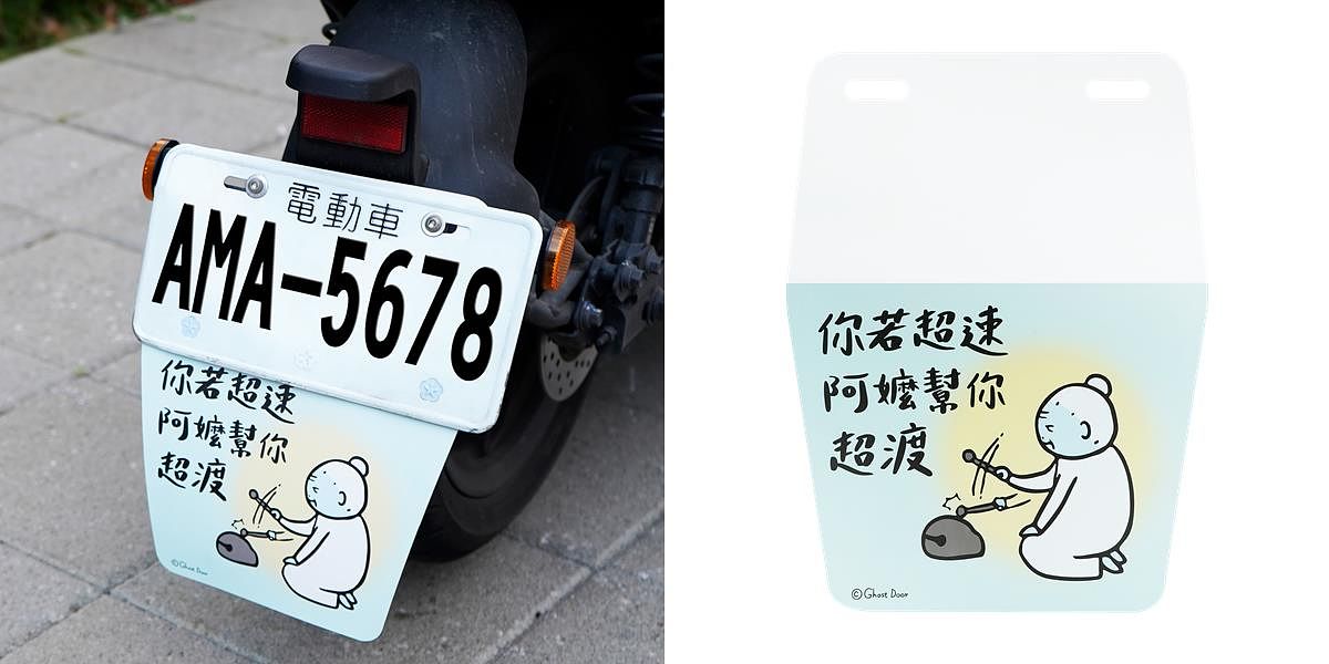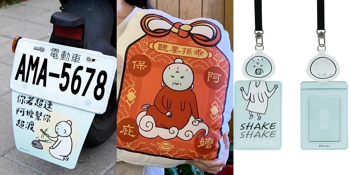 馬路在走,迷因擋泥板要有!縱橫馬路的機車族最討厭不守規矩的「拍咪呀」,尤其飆車超速更是害人害己。裝上阿嬤牌擋泥板,斗大的「你若超速,阿嬤幫你超渡」警語,再秀出敲木魚場景,讓「拍咪呀」通通退散,保庇行車安全!同樣有阿嬤加持的「御守抱枕毯」紅得喜氣,阿嬤超然的乘坐雲上,默默保庇乖孫「一生平安」。還有通勤族、學生族必備的「好兄弟派對伸縮票卡夾」,以派對跳舞為主題,每次拉長都會讓阿嬤的頭身分離,彷彿聽得見阿嬤的尖叫聲,詼諧惡趣味讓人會心一笑。