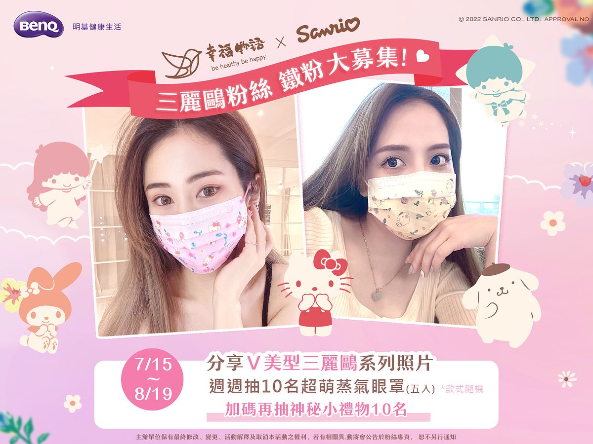 明基佳世達集團明基健康生活與日本精品品牌三麗鷗因應疫情緊張的生活,於日前合作推出口罩聯名款,希望透過旗下少女心噴發的卡通明星,為慌亂的日常帶來溫暖的力量,今日在眾人殷殷引領企盼下,幸福物語第三度聯手推出「花漾樂園系列」之雙星仙子、美樂蒂、三麗鷗全員明星大集合,在暖暖夏日風光登場。此外,為了回饋長期一路支持的消費者,特別舉辦募集鐵粉活動,並周周抽出超萌的獎品,勢必將再讓三麗鷗粉絲為之瘋狂!