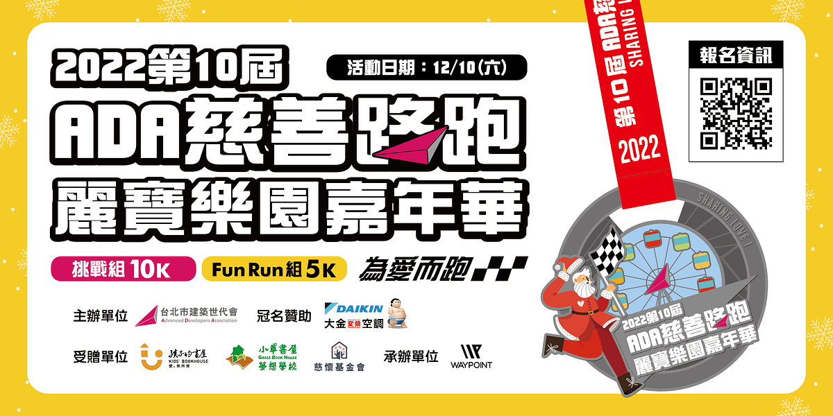 睽違兩年ADA台北市建築世代會所舉辦的ADA慈善路跑重磅回歸!12月10日將在台中麗寶樂園渡假區熱情開跑。首創樂園嘉年華情境的路跑活動,結合麗寶國際賽車場路線,新鮮賽道感受要讓沉寂已久的全民運動再次甦醒。報名費所得亦遵循往例全數捐贈給台東『孩子的書屋』、三峽的『小草書屋』以及宜蘭的『慈懷基金會』,守護兒少,陪伴孩子創造夢想。