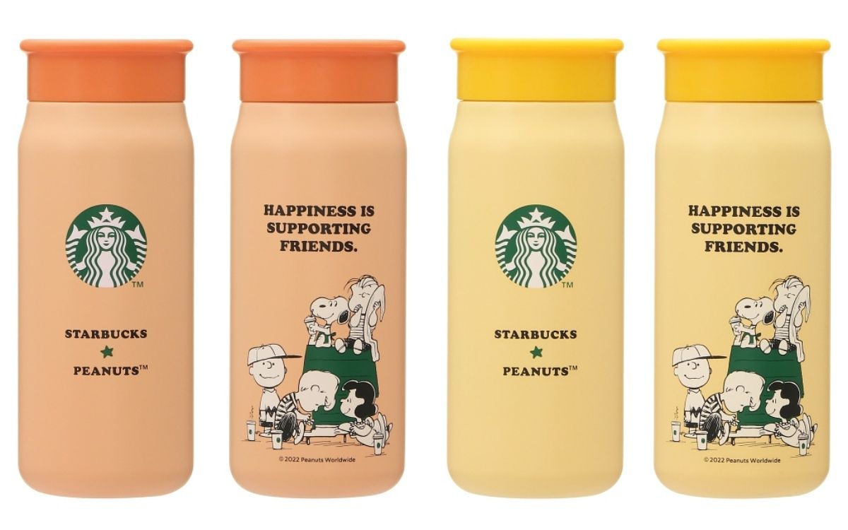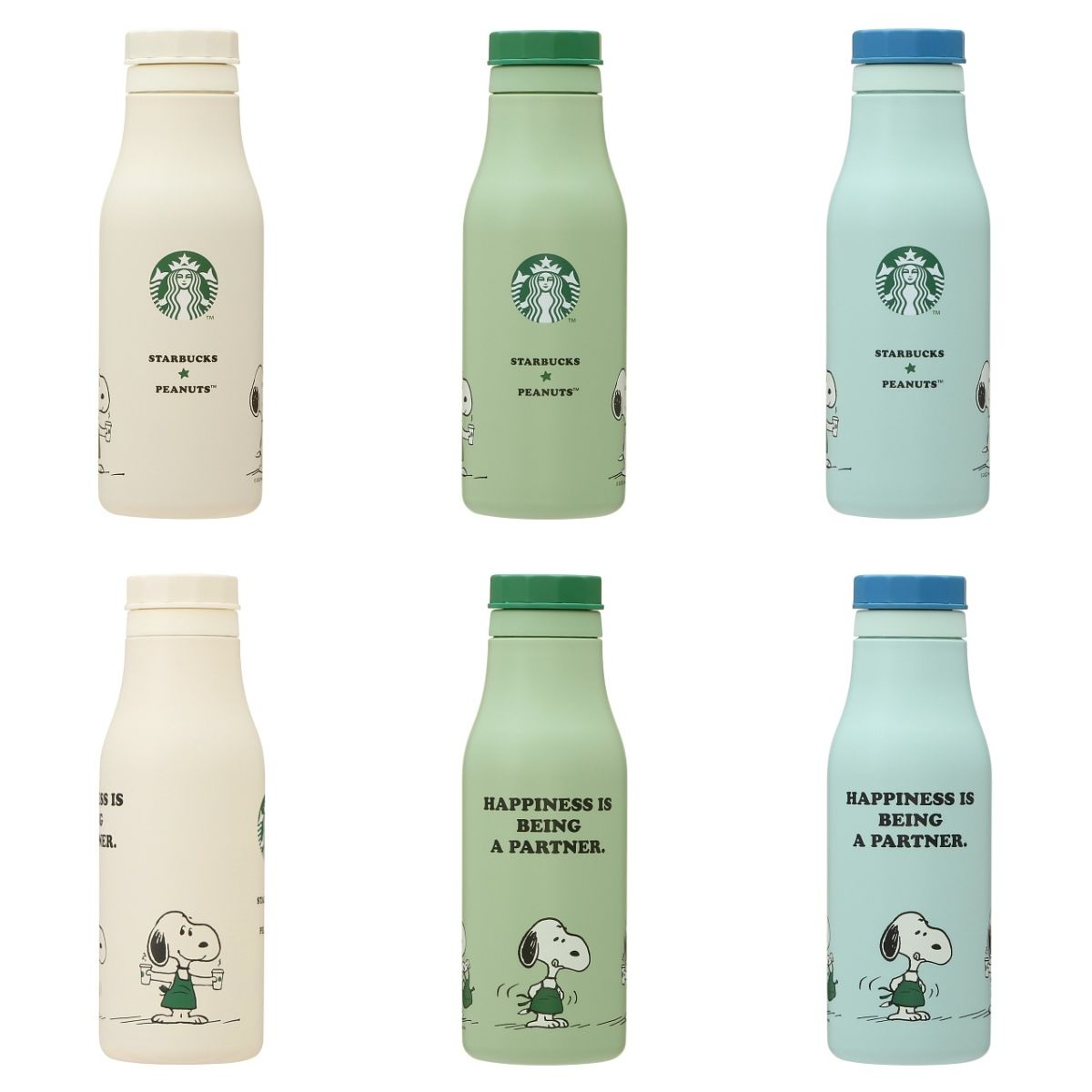 473ml的真空雙結構保溫保冷瓶為不銹鋼瓶身,外層是啞光設計,正面印有STARBUCKS★PEANUTS 標語,而背面則印有“HAPPINESS IS BEING A PARTNER”的文字。瓶子轉動時會看見不同的史努比模樣,拱有米色、綠色與藍色可選擇。