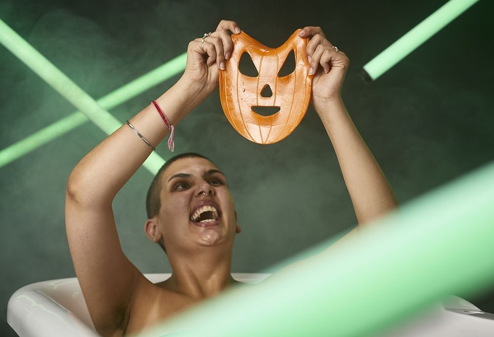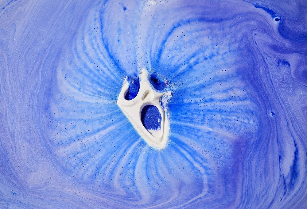 這鬼怪面具已在浴室等候你光臨 - 不用害怕它,甜香和樱桃的香氣會讓人感到安全和愉悦:在這豔藍暖浴中全然放鬆吧!