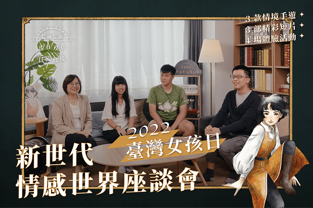 為迎接2022年臺灣女孩日,衛生福利部社會及家庭署(下稱社家署)以當下兒少關注的情感議題為主軸,推出《從前從前·現在現在·以後以後》手機情境遊戲,並於10月11日臺灣女孩日當天透過社家署粉絲專頁及Youtube公開播映「新世代情感世界座談會」,由衛福部李麗芬政務次長與臨床心理師蘇益賢,以及2位兒少透過對談分享,帶領觀眾深入討論情感覺察與人際溝通議題。