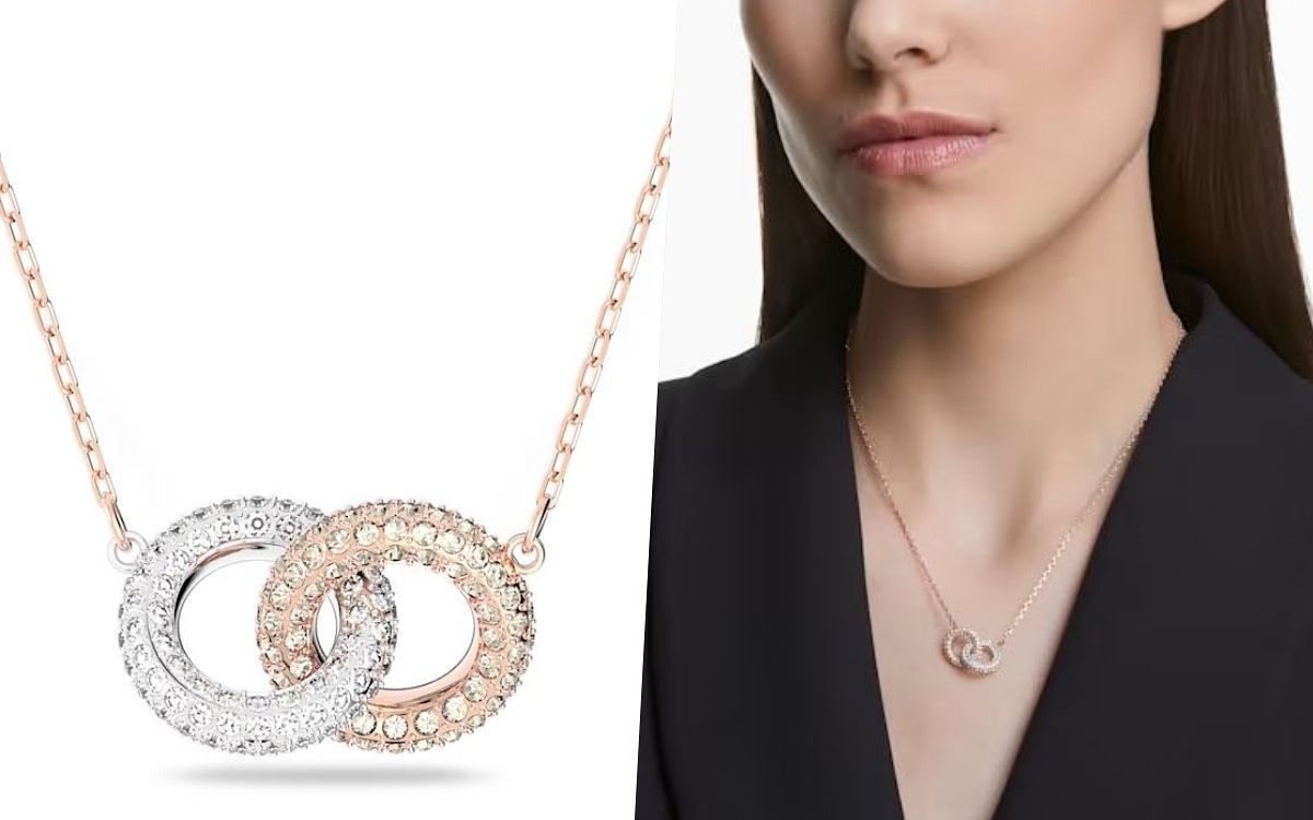 相比於戒指或耳環來說,項鍊基本上更適合於送禮、不易出錯,這款項鏈以相扣的圓環為特色,可為任何裝扮注入奢華魅力。低調含蓄的設計,巧妙揉合玫瑰金與金色及透明密鑲Swarovski水晶,展現出迷人的對比效果,輕鬆駕馭典雅大方的時尚品味。