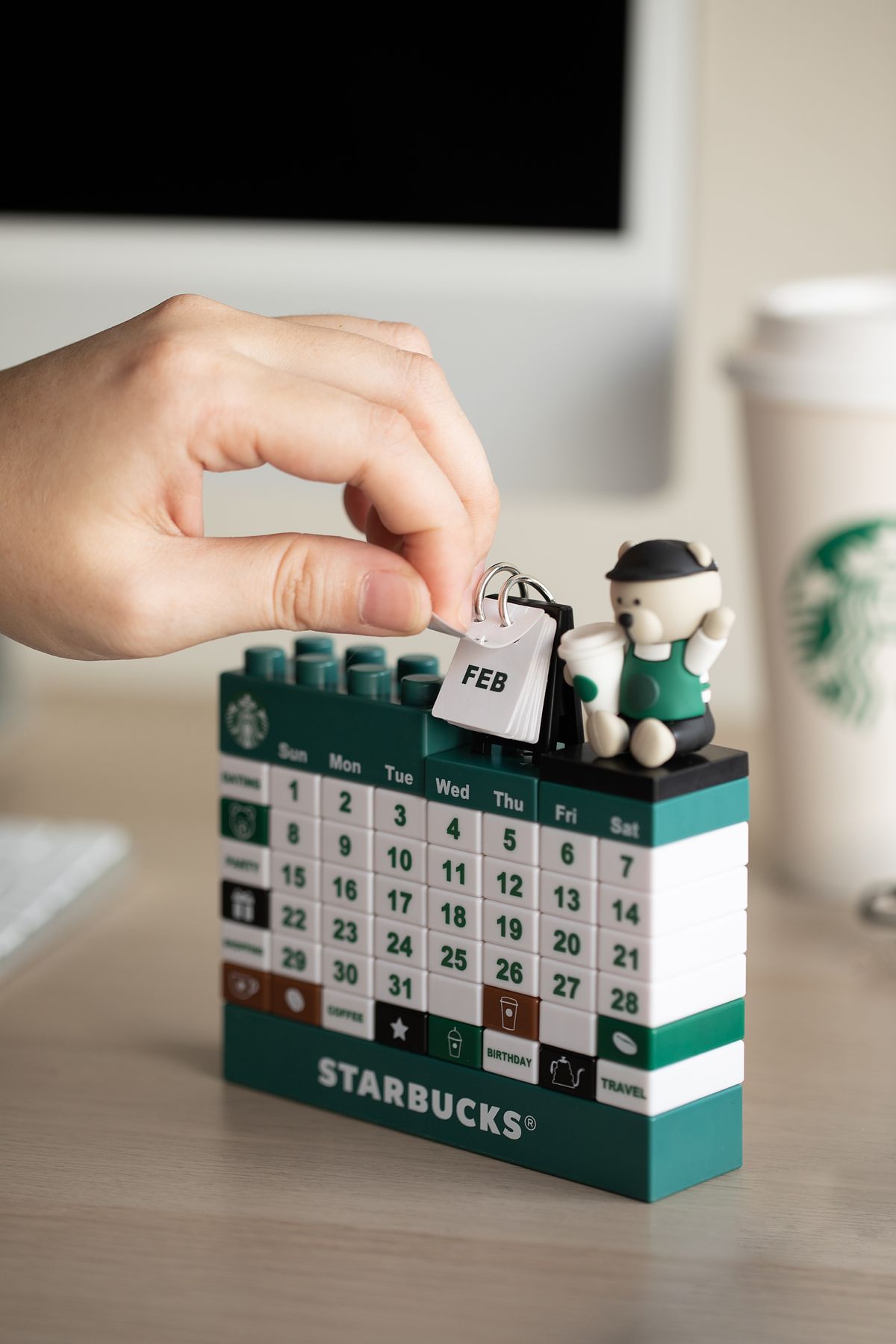 可以手自行翻頁換月份,也可以拼組每月日期的立體桌曆,十分具有手感溫度與趣味,搭配點綴了咖啡或咖啡豆圖樣,邀請顧客一起與Bearista朝氣迎接每一天。