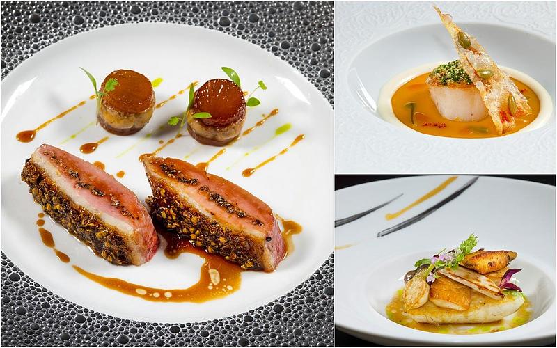 侯布雄日籍主廚松尾洋平精心規劃了充滿驚喜美味的跨年晚宴,餐點包含新鮮爽脆緬因龍蝦、鮮甜北海道干貝、以及經典鴨胸。