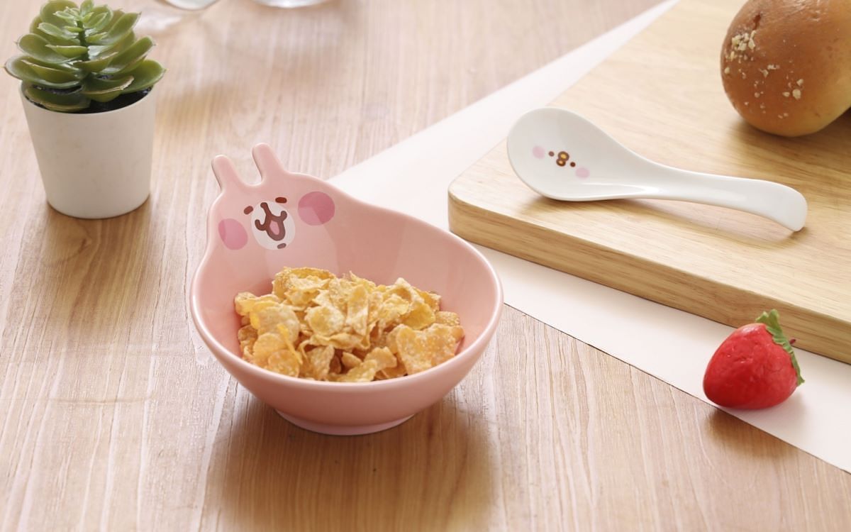 momo獨家開模的卡娜赫拉的小動物造型湯碗湯匙組,碗身印上鮮活靈動的粉紅兔兔,湯匙則是俏皮呆萌的P助,均採用厚實耐熱的陶瓷打造,完美提升用餐氣氛,讓聚餐時光更療癒。