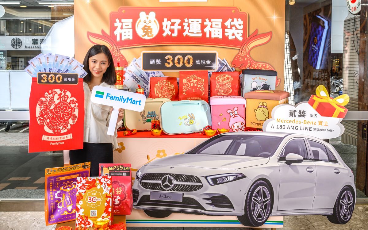 「全家」福袋沒有極限,自2015年領先同業推出春節福袋,每年推出的內容都引起消費者熱烈討論,迅速搶購一空。為回應消費者熱烈支持,2023年「全家」春節福袋再加量至95萬份,預估將創造2億元業績、再掀排隊搶購潮。「全家」福兔好運福袋將於1/1新年元旦開賣,每份售價200元,除了過年必備澎拜零食及飲料外,星級重點抽獎券內容更創下史無前例紀錄,重磅推出業界首見實領300萬現金頭獎,抽中可一人獨得,實現春節財富自由;貳獎也有價值150萬元以上A180 AMG LINE賓士車2台直接開回家,歡迎消費者把握春節開運試手氣,有機會成為萬中選一的幸運兒,預備買房頭期款,就靠「全家」福兔好運福袋。
