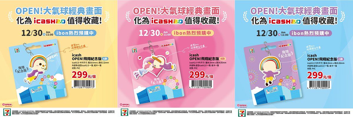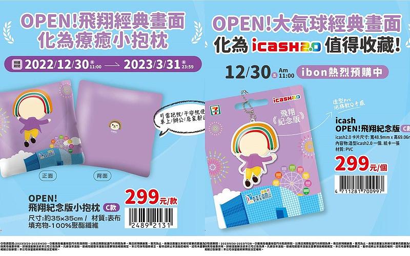 7-ELEVEN回應全民期待,自12月30日起陸續推出實用又應景的「OPEN!飛翔紀念版周邊預購」,首推泡棉PVC材質立體icash2.0,手感Q軟可愛,拿在手上,立即能回顧OPEN將帥氣初登場氣球遊行的英姿,這次絕對要買好買滿;其他另有OPEN將飛天版的造型小抱枕等,陪伴全民飛越2022、躍進2023!