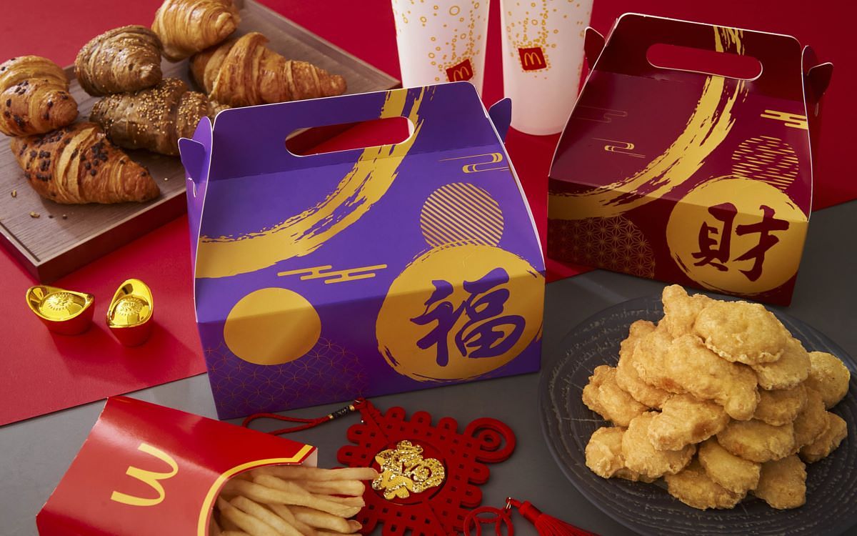 「金迎招財系列」自1月11日至2月14日止(或售完為止)限期回歸,期間購買「金迎招財系列套餐」就送「好運紅包袋」乙份(數量有限,送完為止)。自1月11日至2月14日(或售完為止),麥當勞分享盒將換上「期間限定春節分享盒包裝」並推出新春限定「福氣可頌分享盒」,活動期間購買任一分享盒,加購指定飲品享買一送一,讓您開運納福薯不盡,好運一整年!