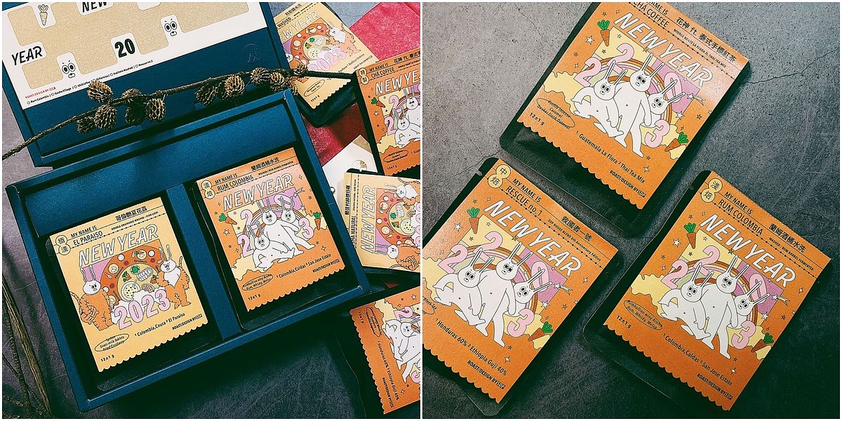 現代人免不了一天一杯咖啡,送咖啡當禮盒也相當對胃,而且店主貼心的配了早安組與晚安組的咖啡,不同的香氣與味道可以搭配不同的情境,最特別的是有款「蘭姆酒桶」,據說是有酒香的咖啡,還真沒喝過!讓人相當好奇~插圖也超有特色,戲棚上的老虎下班囉,換小兔本人出來過年;以及有著神祕隊形的兔兔戰隊,都超級可愛的~