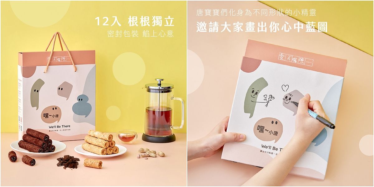 送禮也要愛心不落人後,其實逢年過節許多的公益團體都會推出應景的禮盒,這邊特別挑選唐氏症基金會的蛋捲禮盒,外盒設計超級可愛,還可以自己畫畫或是寫上文字,能直接當成祝福卡片使用!送禮超有獨特風格的~而且花生醬與榛果醬的內餡,可是給滿滿的,能吃到很實在的心意!