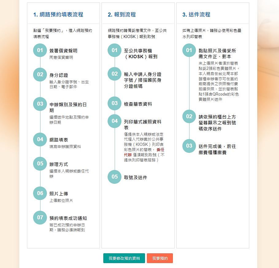 另外也改採大幅擴大網路預約之方式受理護照申請案,且不只增加為每日1500個預約名額,開放預約時間也從20天延長至60天,強烈建議欲申換護照者先上外交部領事事務局網站完成網路預約,填寫相關資料與預約申辦時段,之後只需再依預約時間到指定辦事處之事務機報到、列印已填寫完畢的資料、抽號碼牌並遞件申請,不用再在現場排隊久候。