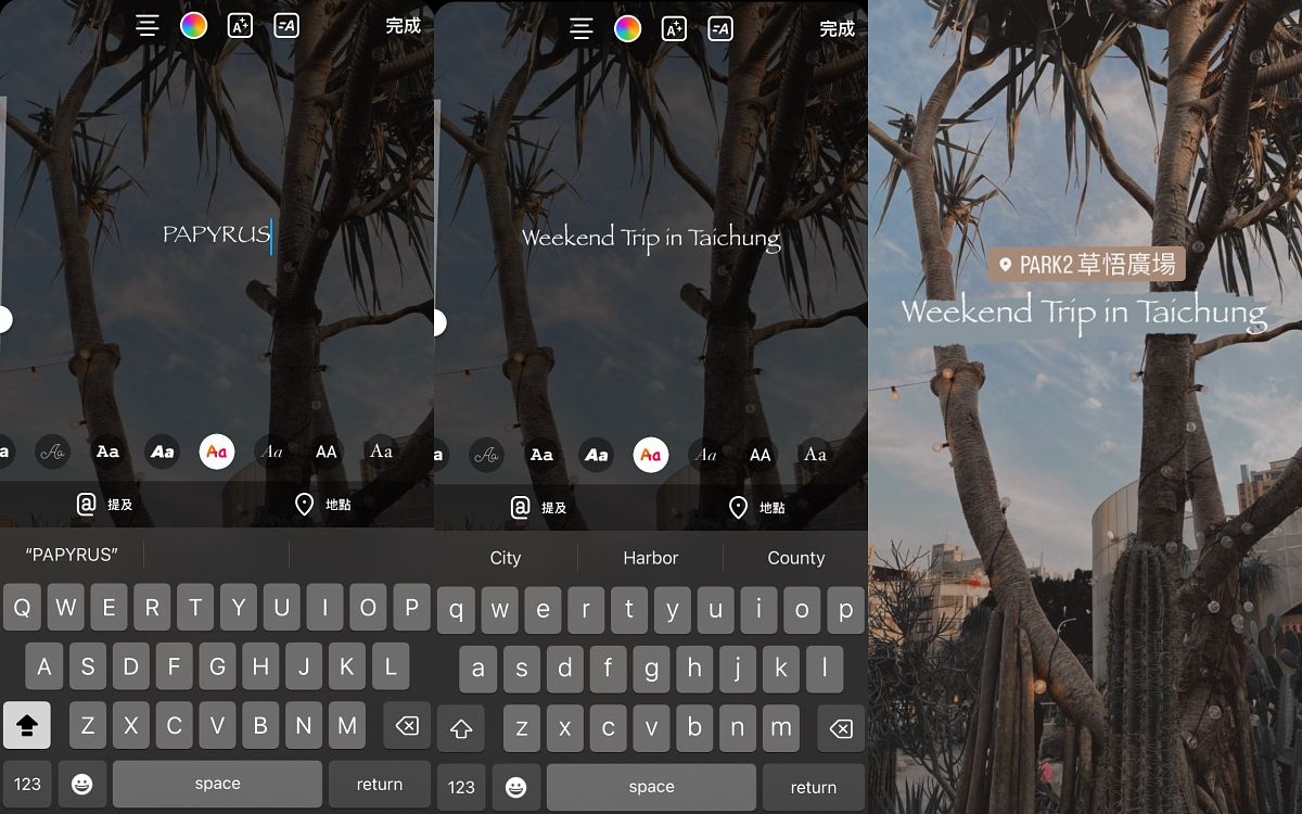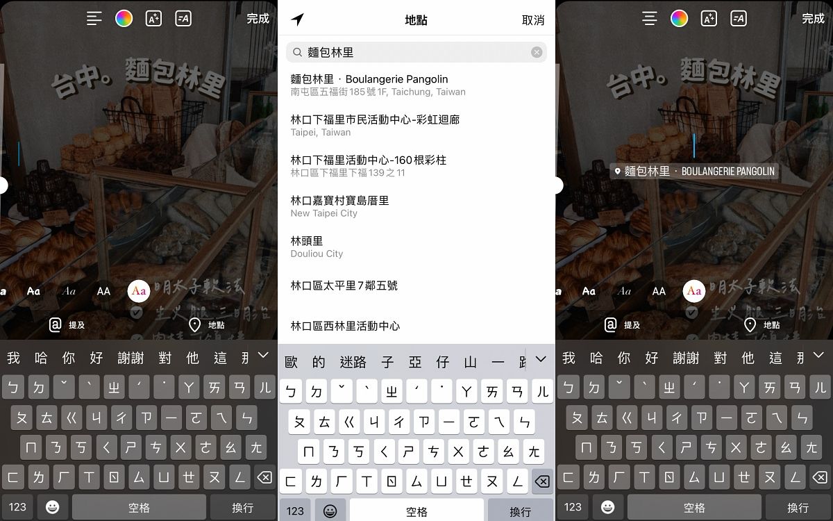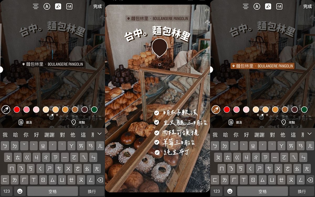 這邊編輯要教大家一個小技巧,可以輕鬆自訂地點貼紙的顏色喔!其實只要改使用【文字】功能,在打字鍵盤上方就會出現【地點】功能,選擇這個之後就會跑到熟悉的地點搜尋步驟,選好地點後就能使用上方【文字顏色】功能來挑選現有顏色或以滴管來吸取想要的顏色,跟日常更換文字顏色的方法相同,且透過點擊貼紙也能變換文字與底色的搭配喔!瞬間地點貼紙立刻時髦起來了~