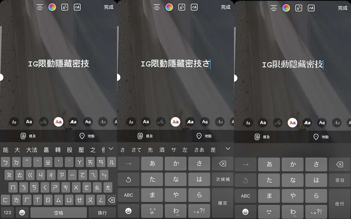 應該不少人都在內心默默吶喊「IG中文字型真的太少了啦!」雖然文字功能總共有九種不同英文字型可選擇,但其實轉換成中文之後根本沒有太大差別…不過IG其實藏有個字體小技巧,文字字型選擇右邊數來第四個後,將鍵盤轉換成日文鍵盤,並隨意打上一個日文字,就能得到截然不同的【明體】字型,建議大家先將想要的文字都輸入完成後,再變換日文鍵盤打上日文字並刪除,就可以完美使用明體,若之後再添加中文就會變回原始字型,需要再操作一次喔!另外需注意,英文是不會變明體的唷~