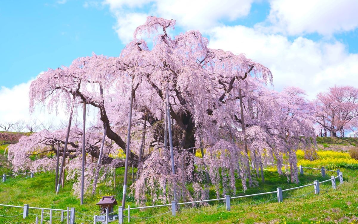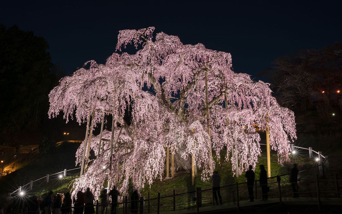 圖片來源:JR東日本 三春瀧櫻是位於福島縣三春町的一株紅枝垂櫻,也是日本五大櫻和三大巨櫻之一,從東京出發兩個小時內即可抵達。三春瀧櫻是福島縣著名的觀光景點之一,樹齡超過1000年,並且樹高達約4層樓,水平長度更是超過20公尺,盛開時有如瀑布ㄧ般傾瀉而下的櫻花非常壯觀。夜間還會點上燈光,不論白天還是夜晚都吸引了大批遊客造訪。