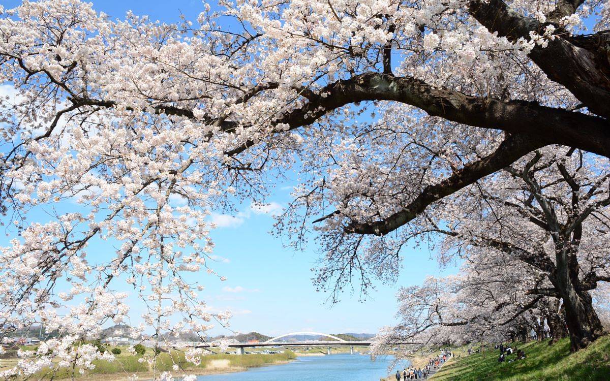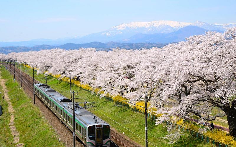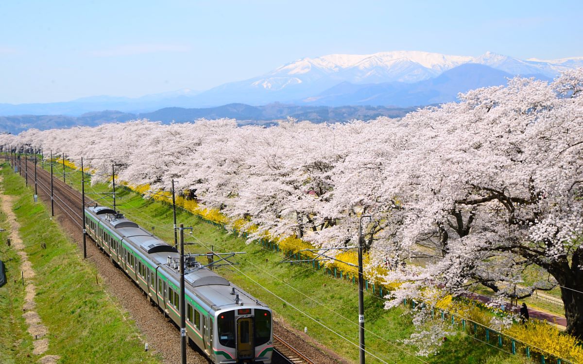 圖片來源:JR東日本 位於宮城縣的白石川堤的一目千本櫻可以說是到日本東北必訪的賞櫻勝地。在綿延約8公里的白石川堤上種植了約1,200棵的櫻花樹,因此有「一目千本櫻」之名。這裡最大的看點就是連綿的櫻花樹與白石川,以及在背景留有殘雪的藏王連峰所交織成的風景。在花期時,JR東北本線電車行駛到大河原站到船岡站之間時還會放慢行駛速度,讓乘客能在電車內透過車窗賞花。