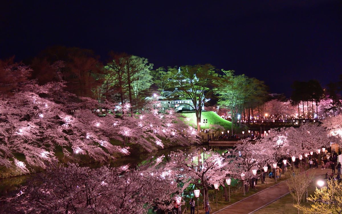 圖片來源:JR東日本 位於新潟縣上越市中心的高田城址公園是新潟縣最著名的賞櫻勝地之一,圍繞公園的廣大內護城河和外護城河周邊約有4,000多棵櫻花樹。夜晚打上燈光的夜櫻尤其出名,與東京的上野恩賜公園、青森的弘前城公園並列為「日本三大夜櫻」,打上照明的櫻花、高田城,加上櫻花映照在護城河的倒影,形成了非常夢幻的景色。此外,花期也會舉辦「高田城址公園賞櫻會」,會有觀櫻會遊行、觀櫻茶會、煙火秀等活動,近年來幾乎每年都有一百多萬人次到訪。