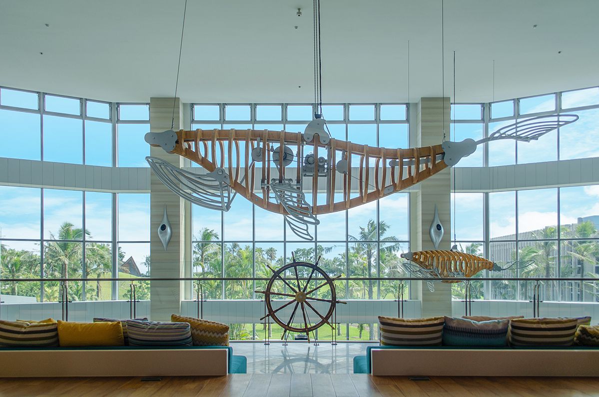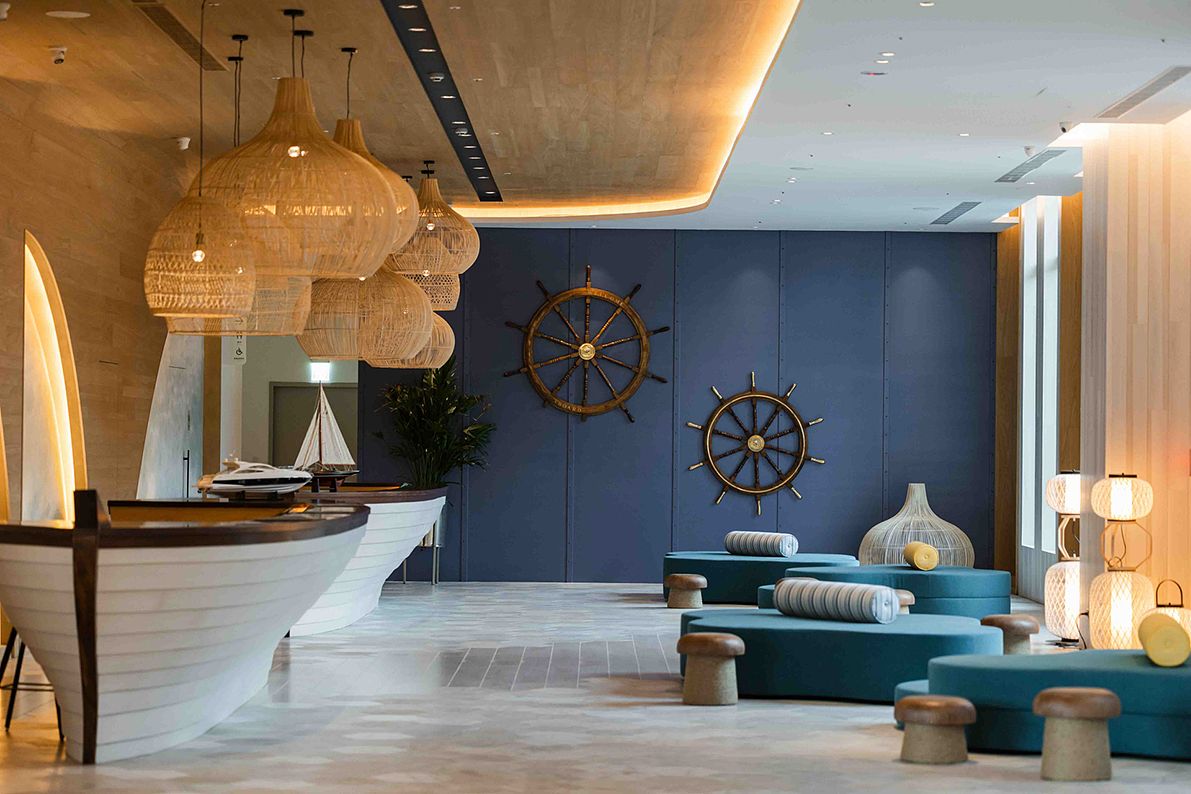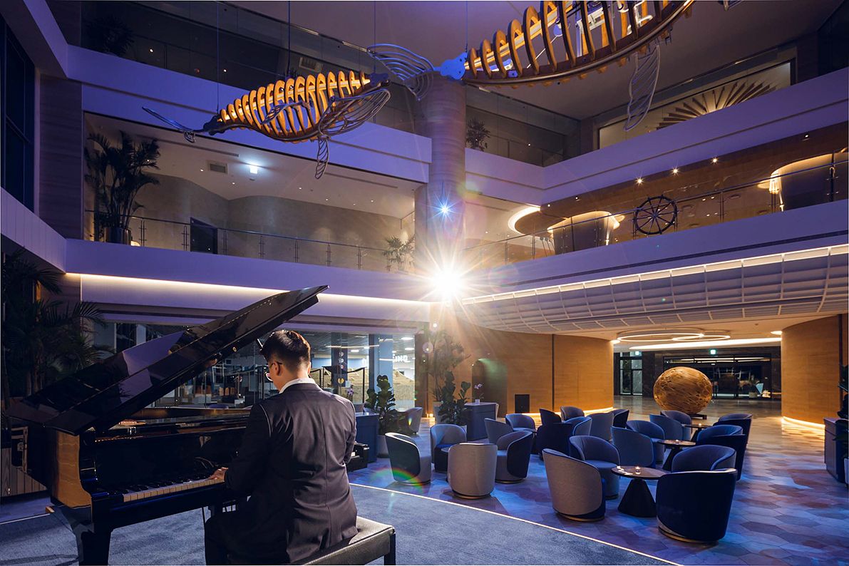 「海」為酒店主軸,飯店海浪意象的遊輪造型外觀醒目吸睛,飯店內裝同樣延伸對海的聯想與熱情,進酒店大門即有如登船踏上甲板之感,展開精采的陸上遊輪假期。