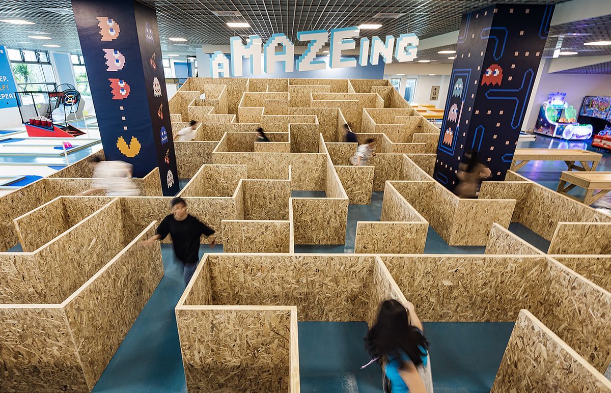 親子共融遊樂室「kids club 同趣」佔地廣達400坪,設有大型室內迷宮、遊戲機台、Crazy mini golf、Nintendo Switch、Shuffleboard 沙狐球,不只小孩玩得開心,大人也能玩得十分盡興。