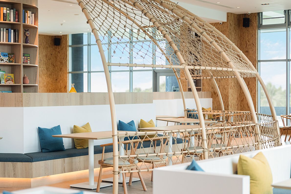 二樓呈現航行在海平面上的世界:空間包含大廳、餐廳與咖啡廳,設計概念則以甲板、船帆與鯨魚為發想,打造出另一個海平面。