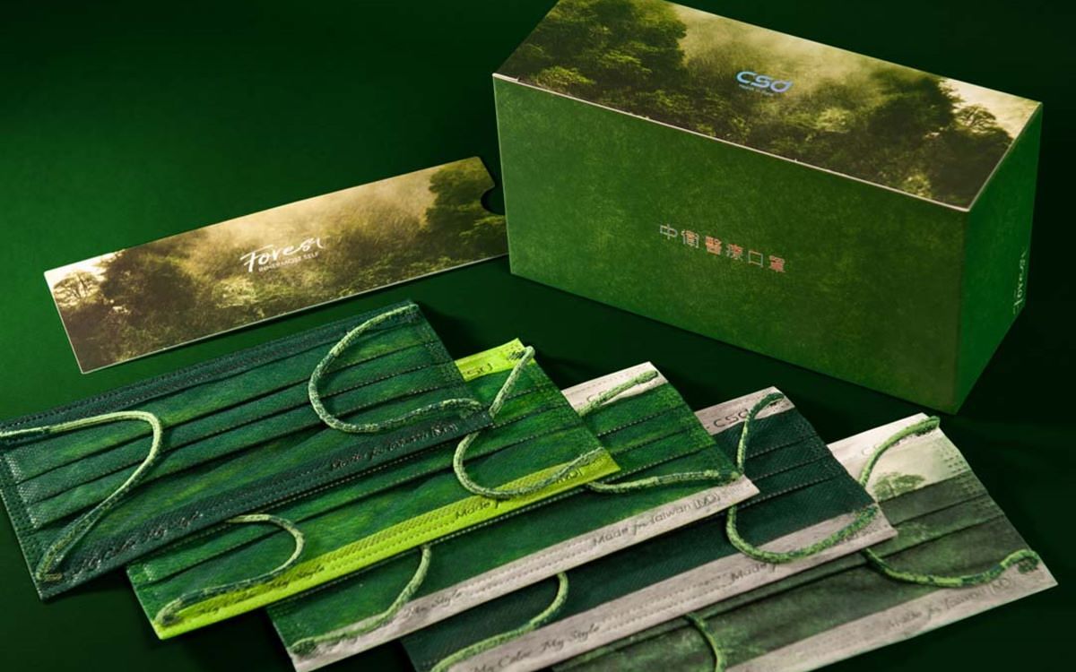 五款「Forest森林口罩」,呈現五款不同森林風貌,其中有三款運用專利雙層疊色設計變化而成,將「炫綠」和「軍綠」兩塊不織布疊在一起,利用透視感製造出森林不同層次的綠。其餘兩款口罩分別為濃密軍綠色,以及一副雲霧繚繞樹梢的優美景緻圖。森林系口罩傳達出柔和的氣息,讓人在一呼一吸間,找回森活的步調。五款口罩均搭配炫綠與軍綠雙色編織舒適耳帶,戴上後讓人舒適地「森」呼吸。