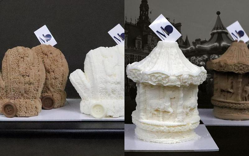 不只是針織設計的坐墊,這種設計也運用做出迷你的包包款蛋糕,運用模具製作出餅乾般的手提把手,底下則是滿滿毛線編織的袋型,還有小巧的巧克力鈕扣裝飾,絕對是拍照打卡必點;還有季節限定的絨毛感手套蛋糕、旋轉木馬,光用看得就很療癒。
