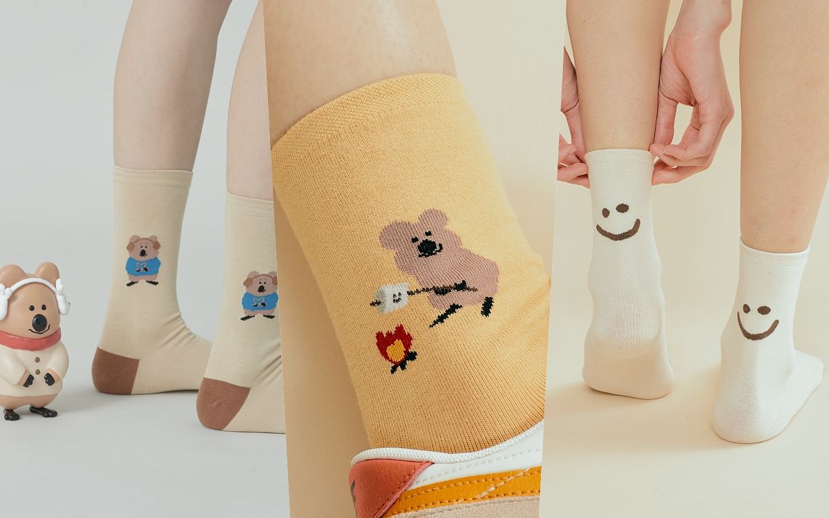 把呆萌有趣的矮袋鼠Quokka放在襪子上實在太可愛了!簡單小巧的角色插圖搭配上柔和粉嫩的顏色,隨意搭上一雙任何運動球鞋都沒問題!另一雙棉花糖笑臉表情的襪子更是值得收,後腳跟的小心機太促咪了!