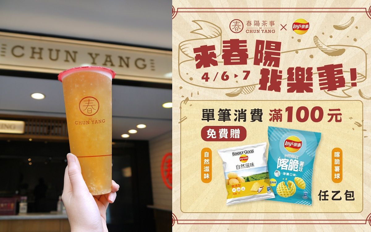 手搖品牌「春陽茶事」攜手「樂事洋芋片」,於4/6至4/7至全台春陽茶事門市單筆消費滿100元即可獲得樂事人氣餅乾,兩款熱銷商品隨機發送,其中包含「喀脆薯球」與另一款「樂事自然滋味」,數量有限,送完為止。